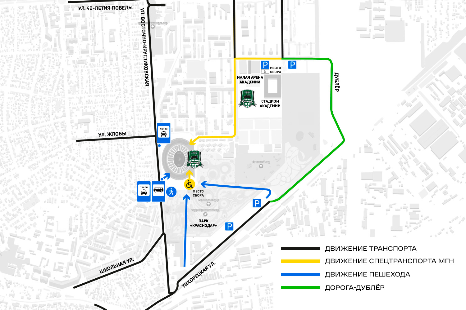 Просим болельщиков не оставлять личные автомобили около жилых домов в микрорайоне по соседству. Специально для посетителей стадиона на улице имени Героя Владислава Посадского, 15 расположены бесплатные парковки, прилегающие к стадиону Академии ФК «Краснодар» и парку «Краснодар».